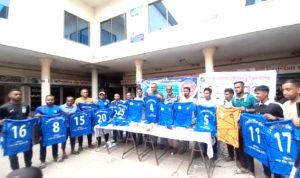 আলোচনা পর্ব শেষে ১ নং খেলোয়াড়দের হাতে জার্সি তুলে দিয়েছেন অনুষ্ঠানের অতিথি বৃন্দ।